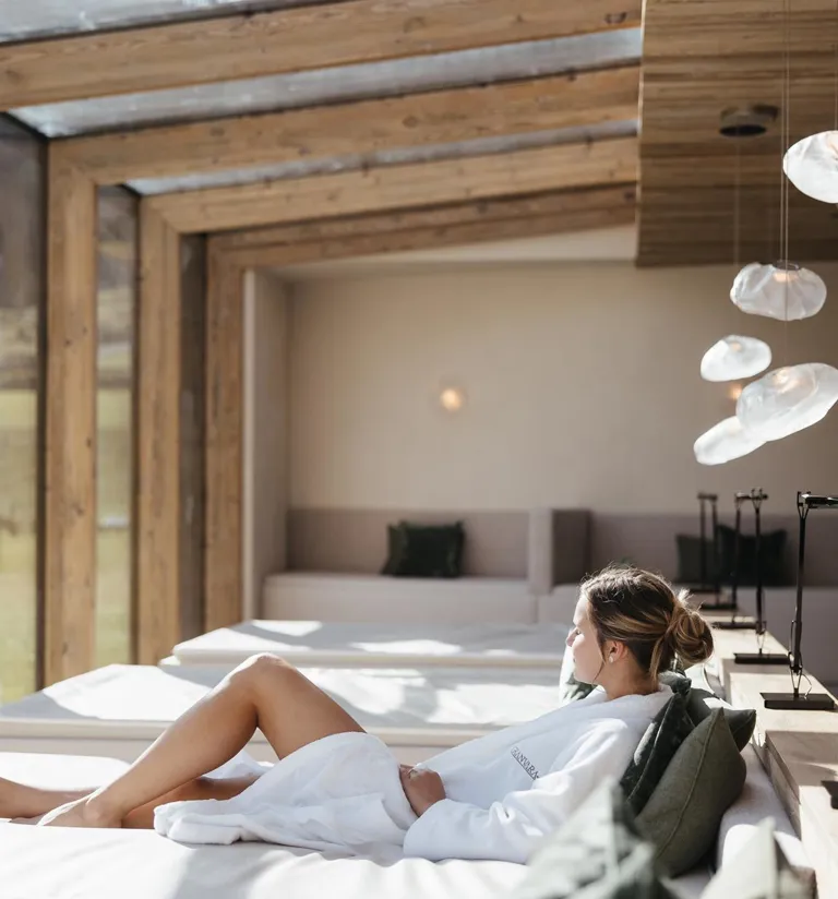 Spüren Sie das leise Glück? Dieses Gefühl tiefen Wohlbefindens, das ganz unerwartet auftaucht? Hier entfaltet es sich mit Sicherheit beim Relaxen in unseren neu gestalteten, edlen Ruheräumen mit traumhaftem Blick auf die Dolomiten.