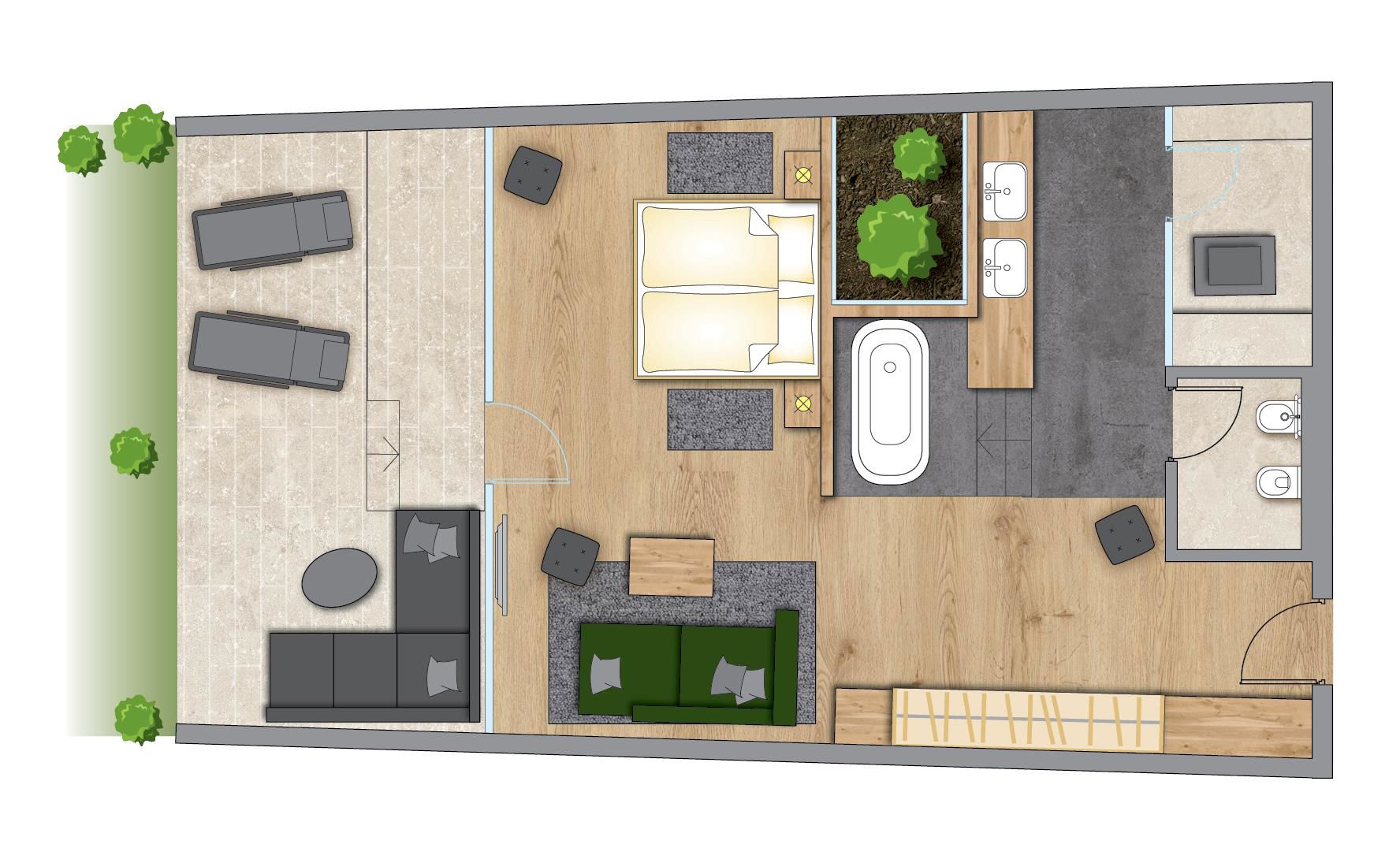 NEW Wellness Suites Premium with all the luxury that a Suite can offer. The most special thing: „ a live tree in the Suite” and as well as a large private sun terrace with amazing view to the Dolomites and the village of Selva. NEW ART OF LIVING!